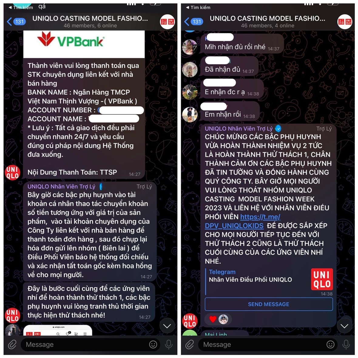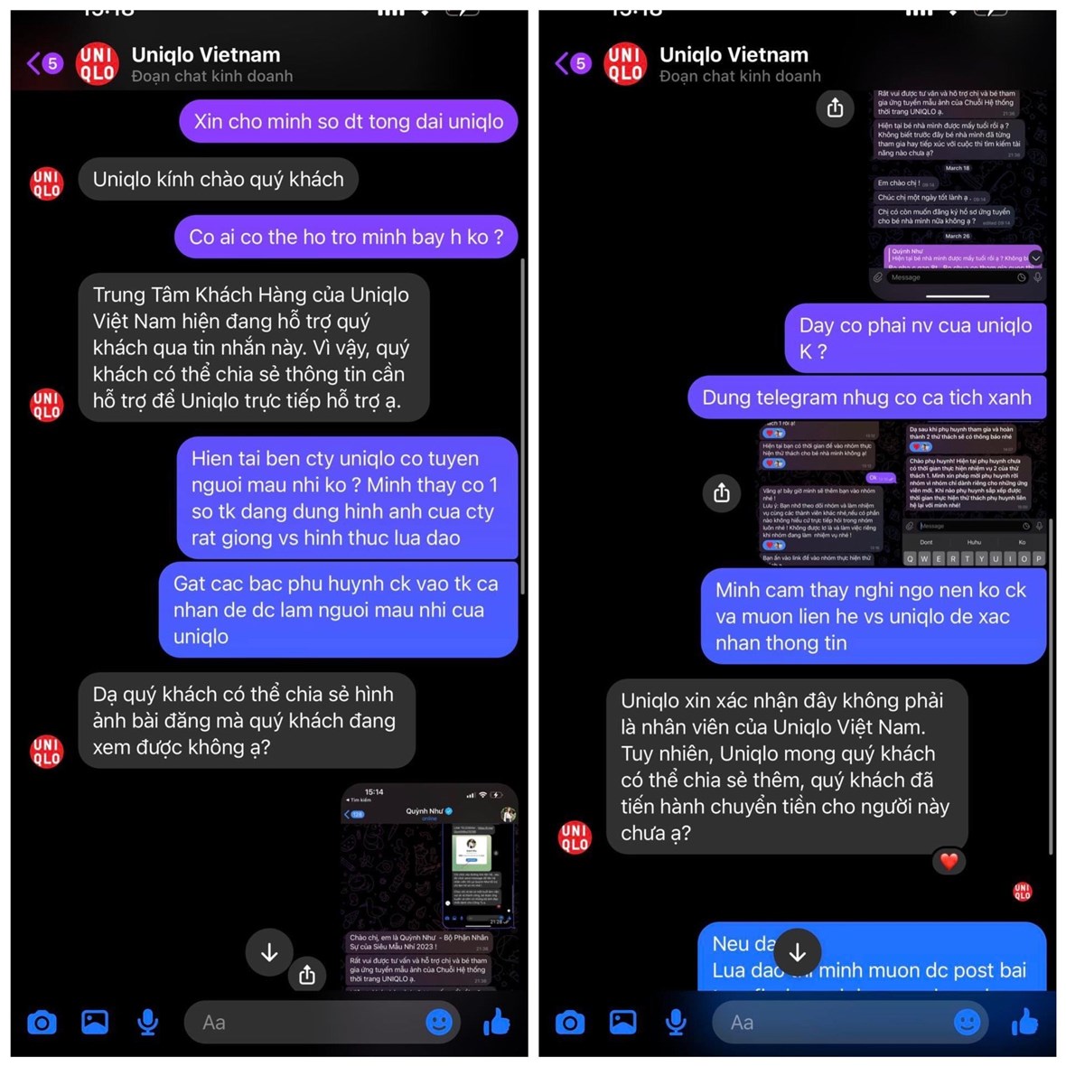 Khi nhận thấy những dấu hiệu lừa đảo từ các đối tượng, chị C. đã trực tiếp liên hệ với bên đại diện chính thức của UNIOLO Việt Nam để xác thực. Tuy nhiên, phía nhãn hàng cho biết hoàn toàn không có nhân viên và nhóm Telegram tuyển mẫu nhí như chị C. cung cấp.