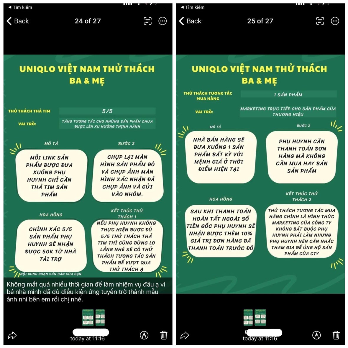 Ở nhiệm vụ thứ hai, các đối tượng yêu cầu phụ huynh thực hiện yêu cầu mua hàng và thanh toán chuyển khoản với lí do ủng hộ các sản phẩm của công ty, cùng với “món hời” sẽ được chuyển hoàn tiền lại 100% số tiền, cộng thêm 10% tiền hoa hồng. Tuy nói rằng đây không phải nhiệm vụ bắt buộc nhưng nếu không làm thì sẽ không đủ điều kiện qua vòng xét tuyển hồ sơ.