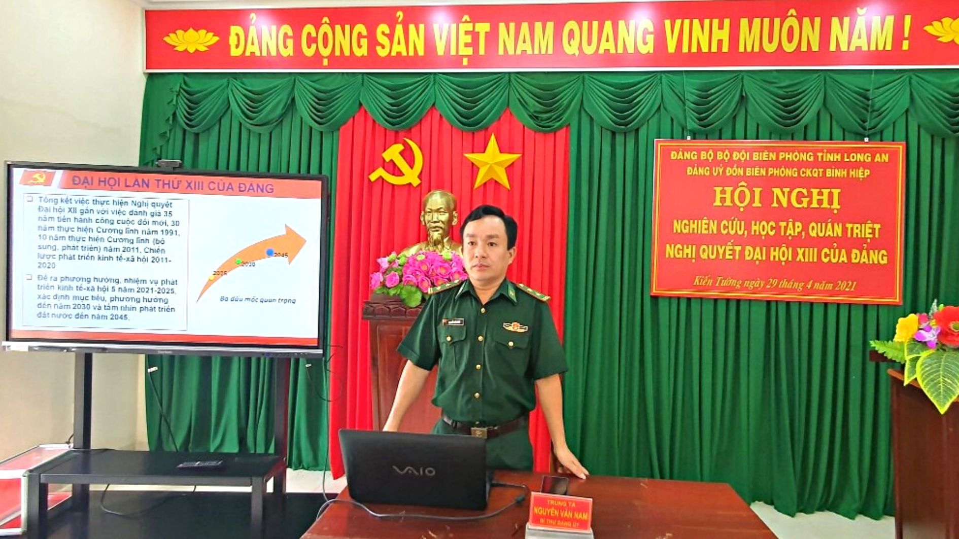 Với phương châm ưu tiên tuyên truyền sâu vào từng hộ dân, trong đợt cao điểm bùng phát dịch COVID-19 năm 2021, ĐBP Cửa khẩu Quốc tế Bình Hiệp đẩy mạnh tuyên truyền bằng nhiều hình thức, đặc biệt áp dụng hiệu quả mô hình “Tiếng loa Biên phòng”. Trung tá Nam cùng các cán bộ của Đồn không chỉ gắn loa trên ô tô để phát tại những khu vực rộng, đông dân cư; mà còn gắn loa lên các xe gắn máy, len lỏi các góc đường để đảm bảo người dân, kể cả những hộ dân ở vùng sâu, vùng xa nắm được đầy đủ thông tin. Từ đó, tích cực đấu tranh ngăn chặn thông tin sai lệch, làm tốt công tác định hướng dư luận, giáo dục, nâng cao nhận thức khu vực biên giới về công tác phòng chống dịch.