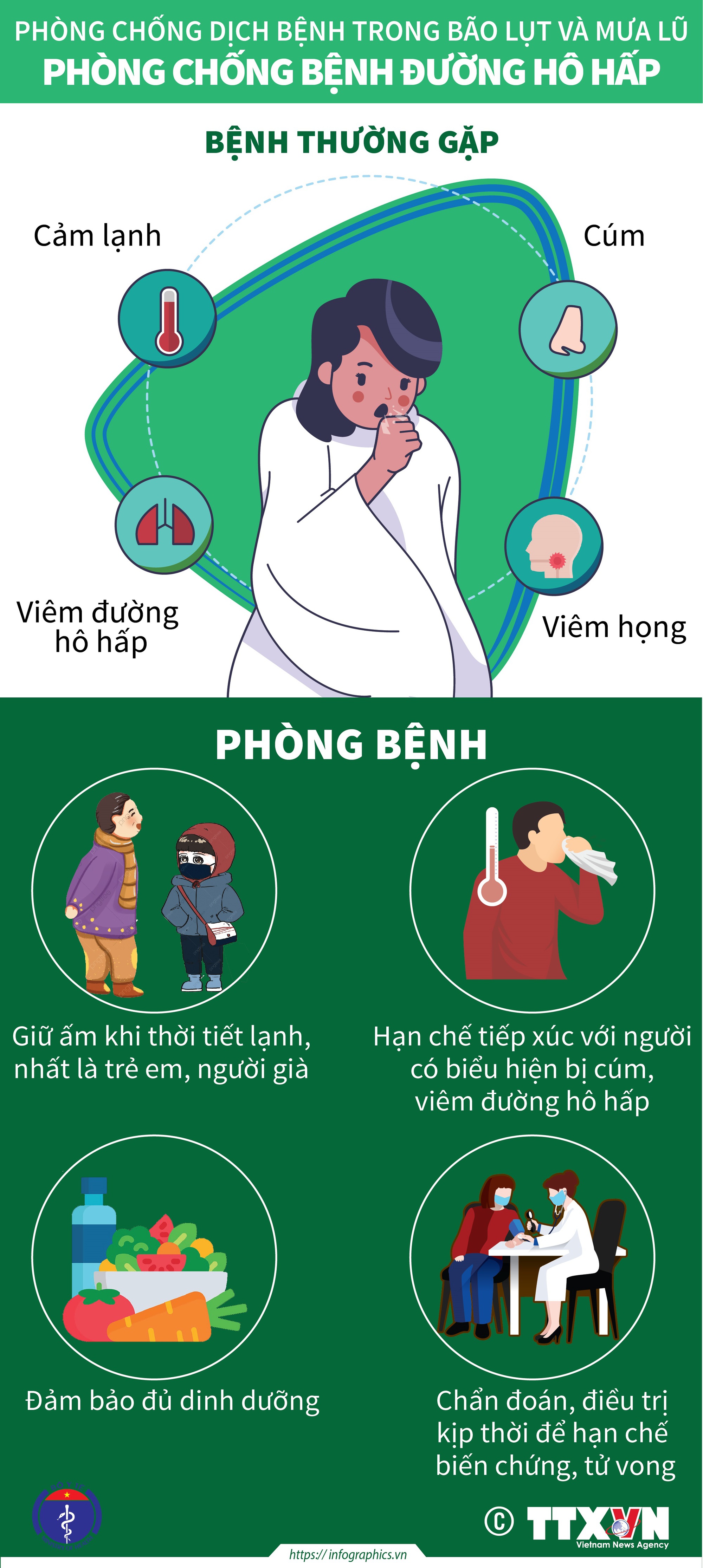 Hơn nữa, mưa và ngập lụt là điều kiện thuận lợi để các loại vi khuẩn, vi rút và trung gian truyền bệnh sinh sôi phát triển và gây bệnh cho con người. Những dịch bệnh thường hay gặp trong mùa mưa lũ là: tiêu chảy cấp, bệnh đường hô hấp, bệnh về mắt, bệnh ngoài da, sốt xuất huyết, đặc biệt là nguy cơ của dịch bệnh COVID-19 trong điều kiện bão lũ, thiên tai.