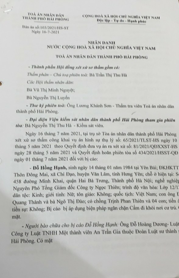 Cũng theo bản án, bà Tạ Thị Tần, ông Trịnh Phan Diễn, ông Trịnh Phan Thiên, bà Trịnh Thị Xuân (đều là người của Cty Ngọc Thiên) “tài liệu điều tra có tham gia trong việc làm hồ sơ, thủ tục để xuất khẩu lô hàng trên”.