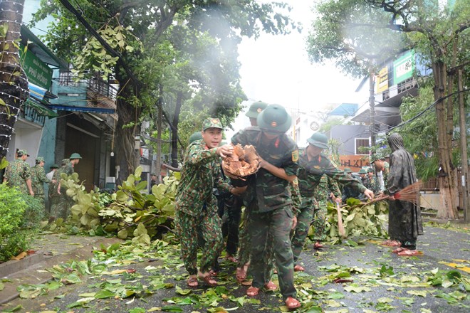 Đại tá Nguyễn Quang Vinh, Phó Chỉ huy trưởng Bộ Chỉ huy quân sự thành phố Đà Nẵng cho biết, trong sáng 28/9, Bộ Chỉ huy quân sự thành phố đã cắt cử hàng chục cán bộ, chiến sỹ kịp thời hỗ trợ người dân dọn vệ sinh đường phố.