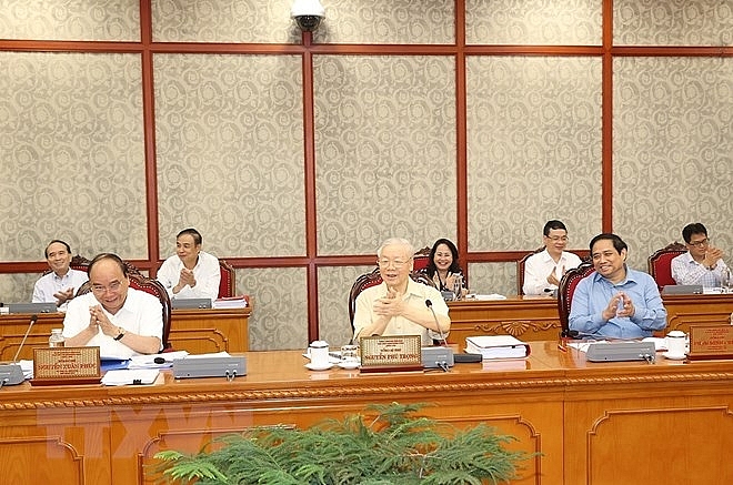 Tổng Bí thư Nguyễn Phú Trọng với các đồng chí trong Bộ Chính trị, Ban Bí thư dự cuộc họp. (Ảnh: Trí Dũng/TTXVN)